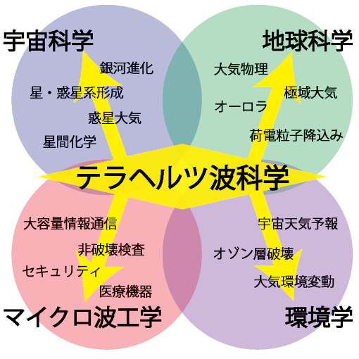 周波数30 GHz以上(波長10 mm以下)の高周波の電波領域は、ミリ波・サブミリ波・テラヘルツ波と呼ばれますが、特に周波数100 GHzから10 THz(波長3 mmから30 µm)にかけての領域は、電子デバイス(エレクトロニクス)技術で扱う電波と光学素子(フォトニクス)技術で扱う赤外線の境界領域にあたり、発振・伝送・検出・増幅といった基礎技術が未開拓なため、「テラヘルツ・ギャップ」とも呼ばれる"電磁波最後のフロンティア"です。 一方で、宇宙/地球研究のような先端科学領域では、分子や原子の回転遷移スペクトルの多くがこの周波数帯に存在することや、地球大気が放射する長波長成分エネルギーの半分以上がこの周波数帯を占めることなどから、古くから重要な領域として注目・利用されてきました。実際、現在世界最先端の大型電波望遠鏡であるALMA干渉計(南米チリで稼働中)では950 GHzの受信機、NASAの地球観測衛星Aura-MLSでは2.5 THzの検出装置などが既に使われていて、多くの成果を挙げています。 本研究室では、「テラヘルツ波を科学する・テラヘルツ波で科学する」をテーマとし、「テラヘルツ波」をキーワードに宇宙科学・地球科学の観測的研究はもとより、私たちの生活とも密接に関係する環境学/環境問題解決や電波工学/新デバイス開発への応用・展開を図っていきます。 |